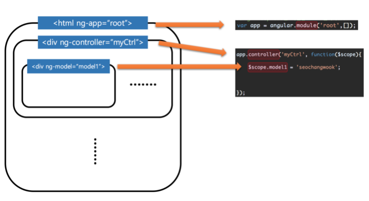 the ng-app attribute is typically set on the <html> tag, indicating that the HTML file follows the AngularJS model. Controllers are implemented within <div> elements, allowing the grouping of related functionality within a controller code block. To define a controller, a callback function called controller() is used. Multiple controllers can be created based on different functional areas. Finally, the binding between the controller and the view needs to be established. The $scope interface facilitates this binding, allowing the view to access the data (model) within the controller using $scope.modelName notation. When values are updated, the view is automatically refreshed. Each scope can access the data within its corresponding controller area.